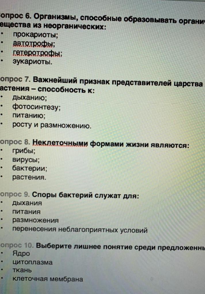 1. Автотрофы, 2. Фотосинтезу, 3. Вирусы, 4. Для перенесения неблагоприятных условий, 5. Ткань.