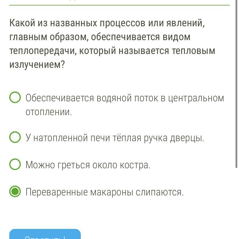 Какой из названных процессов или явлений, главным образом, обеспечивается видом теплопередачи, который называется тепловым излучением?
