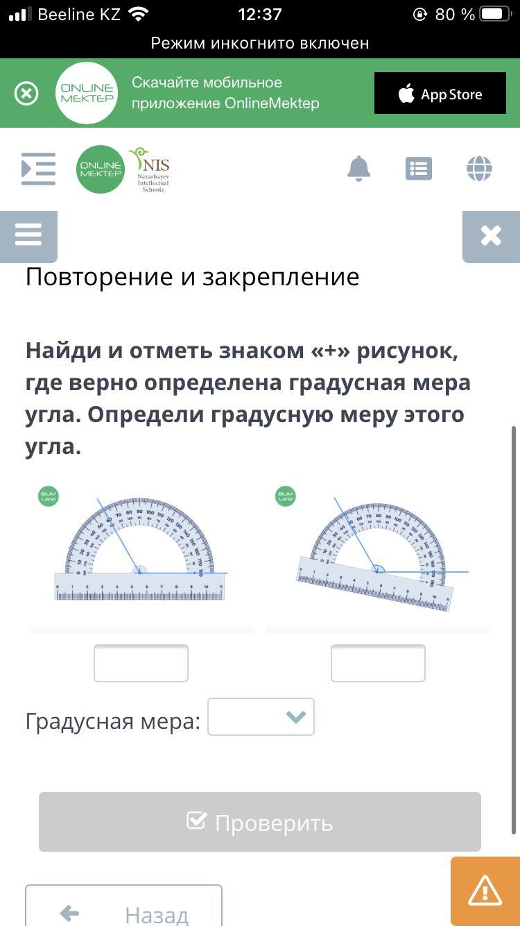 Повторение и закрепление Найди и отметь знаком «+» рисунок, где верно определена градусная мера угла. Определи градусную меру этого угла.
