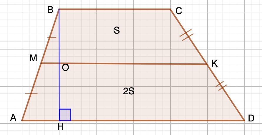 Уравняем площади верхней и нижней трапеций согласно условию: