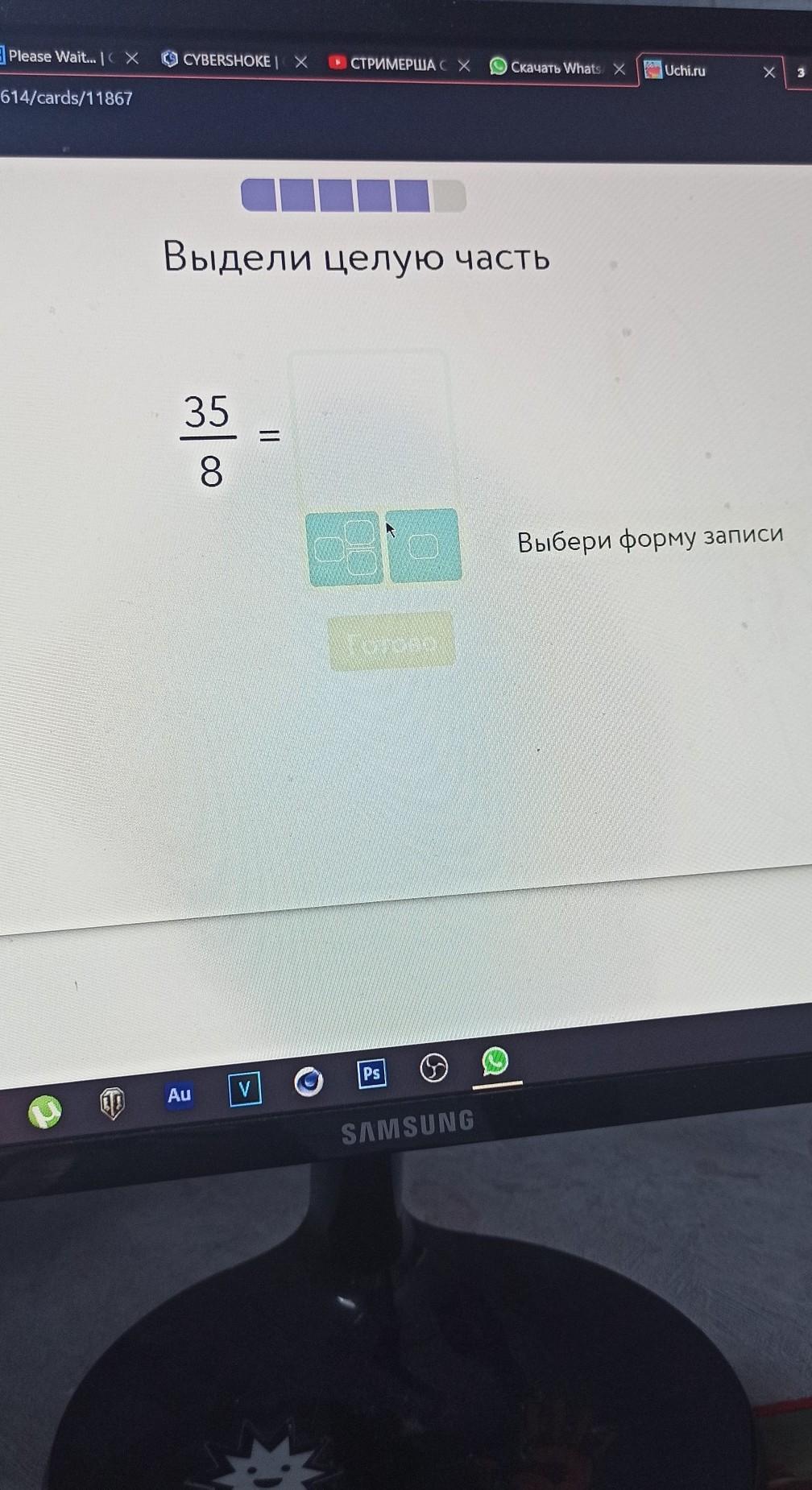 35: 8 = 4 и остаток 3. Значит дробь 4 целых 3 / 8 на держи