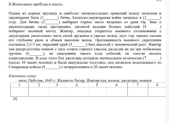 Одним из первых крупных и наиболее знаменательных сражений между казахами и джунгарами была (1 битва. Казахско-джунгарская война началась в (2 голу. Для битвы (3 выбирает горное место недалеко от реки Ор. Зная о превосходящих силах противника, тактикой ведения боевых действий (4 ) избирают окопный метод. Жангир, опасаясь открытого военного столкновения с джунгарами. расположил часть своей дружипы в ущелье между двух гор, заранее оконав его глубоким рвом и обнеся высоким валом. Протяженность военного укрепления составила 2,5-3 км, передний край (5 ) был высотой с человеческий рост. Жангир