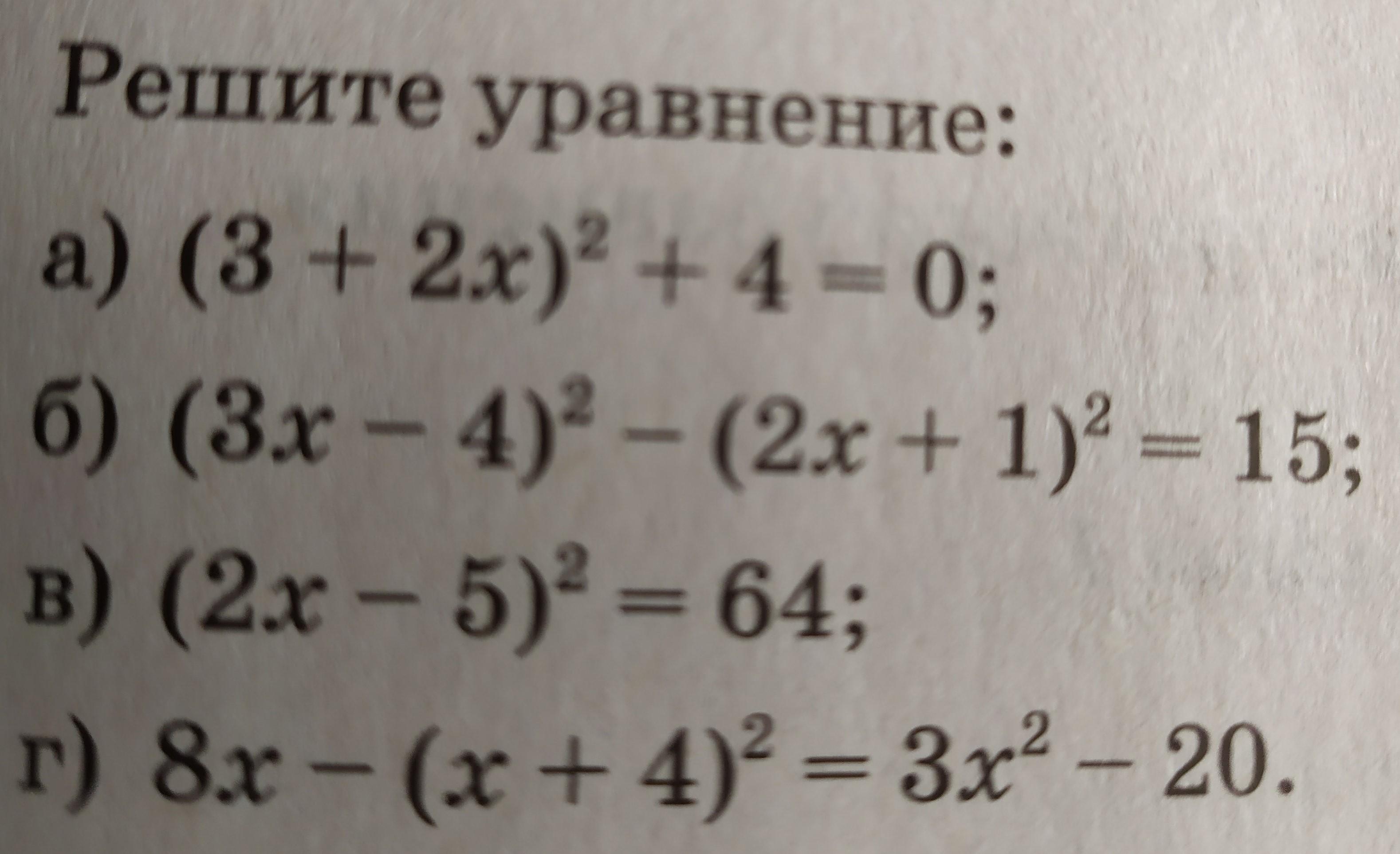 (3+2x)²+4=0; 9+12x+4x²+4=0; 4x²+12x+13=0; D=144-208=-64