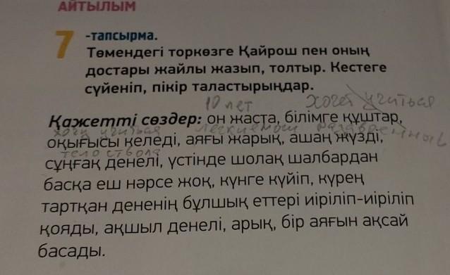 Төмендегі торкөзге Қайрош пен оның достары жайлы жазып,толтыр.Кестеге сүйніп,пікір таластырындар