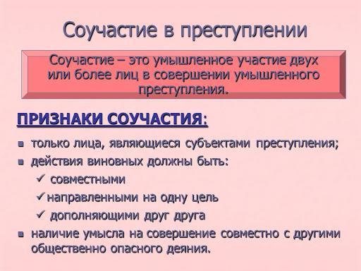 Соучастие в преступлении — различные случаи совершения преступного деяния несколькими лицами. ... Так, по российскому уголовному праву под соучастием понимается умышленное совместное участие двух или более лиц в совершении умышленного преступления.