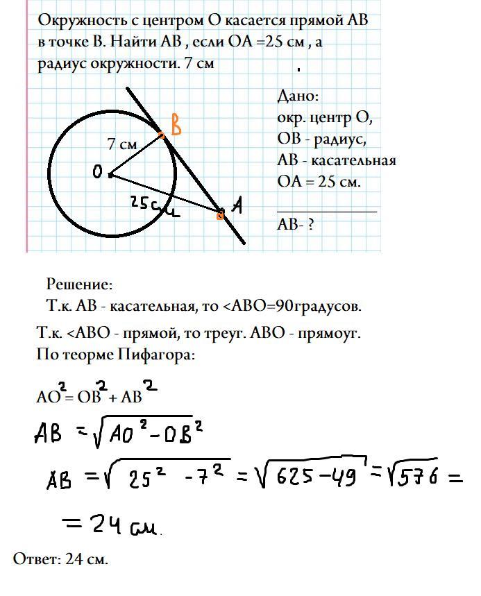 окружность с центром О касается прямой АВ в точке В. Найти АВ , если ОА =25 см , а радиус окружности. 7 см