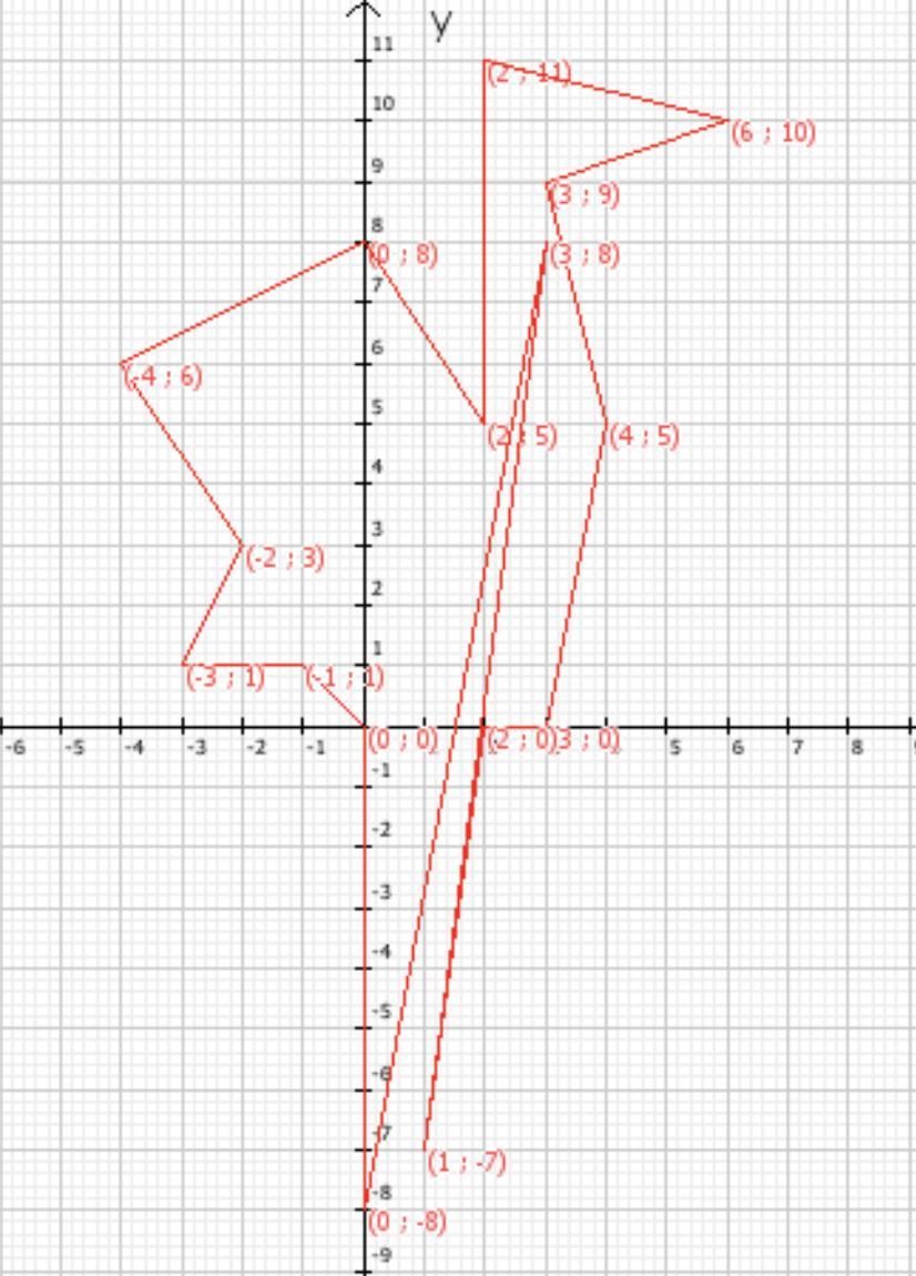 постройте координатную плоскасть. отметьте и посдедовательно соедените следушие точки (0,0) (-1,1) (-3,1) (-2,3) (-4,6) (0,8) (2,5) (2,11) (6,10) (3,9) (4,5) (3,0) (2,0) (1,-7) (3,8) (0,-8) (0,0)