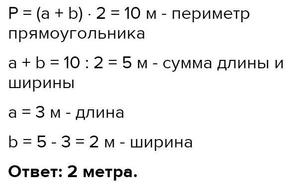 Периметр прямоугольника равен 10 м. Определи ширину прямоугольника, если его длина равна 3 м. 1) =(м) – сумма длины и ширины 2) =(м) – ширина Ответ: метра.