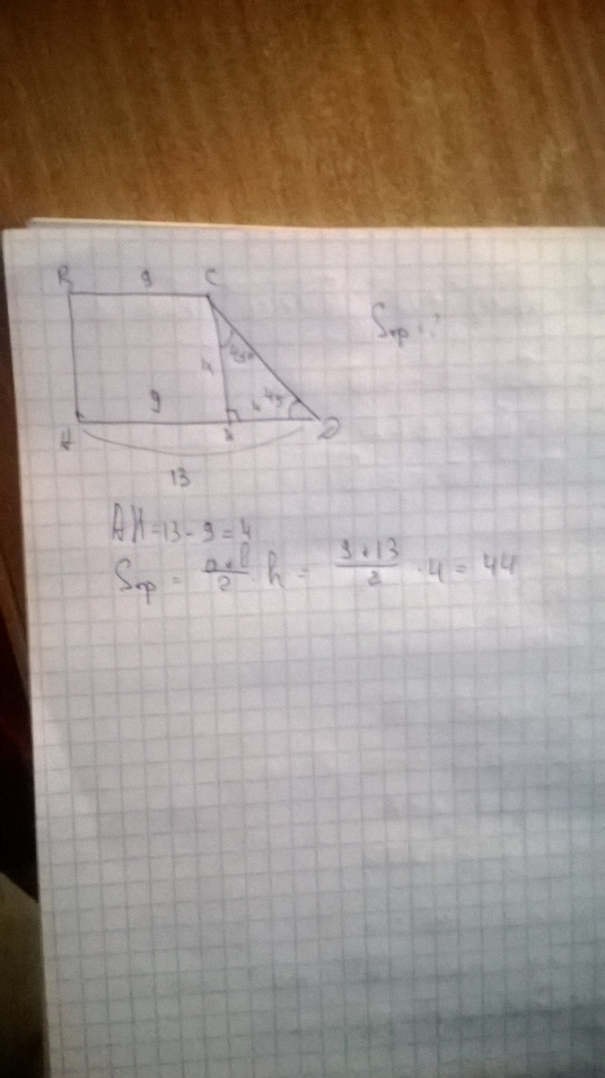 Найдите площадь прямоугольной трапеции, основани которой равны 9 и 13, больша бокова сторона составлет с основанием угол 45 градусов.