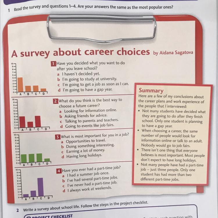 Ответ:1) Ты решил что ты будешь делать после школы? а. Я ещё не решил, b. Я пойду в универ, c. Я собираюсь пойти на работу, d. Я собираюсь взять академический отпуск. 2)Каким ты считаешь лучший путь для поиска работы? a.найти информацию в интернете, b. Спросить у друзей совета, c.Поговорить с родителями или учителем, d.Ходить на мероприятие такие как, ярмарка вакансий. 3) Что очень важно для тебя в работе? a)возможность путешествовать, b)делать интересное, c. Зарабатывать много денег, d.Иметь больше отпуска, 4) У тебя когда нибудь была временная работа? a)Однажды была, b)у меня было несколько таких работ, c)у меня никогда не было,d)я обычно работаю на выходных