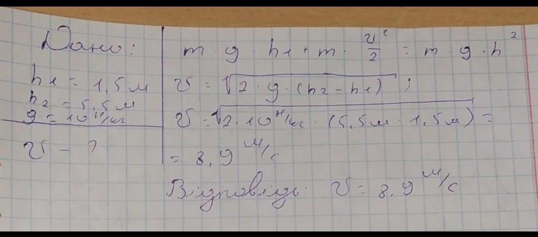 М’яч кинули вниз із висоти 1,5 м відносно підлоги. З якою швидкістю був кинутий м’яч, якщо після удару об підлогу він підстрибнув на висоту 6,5 м? Втратами енергії під час руху та удару знехтувати.