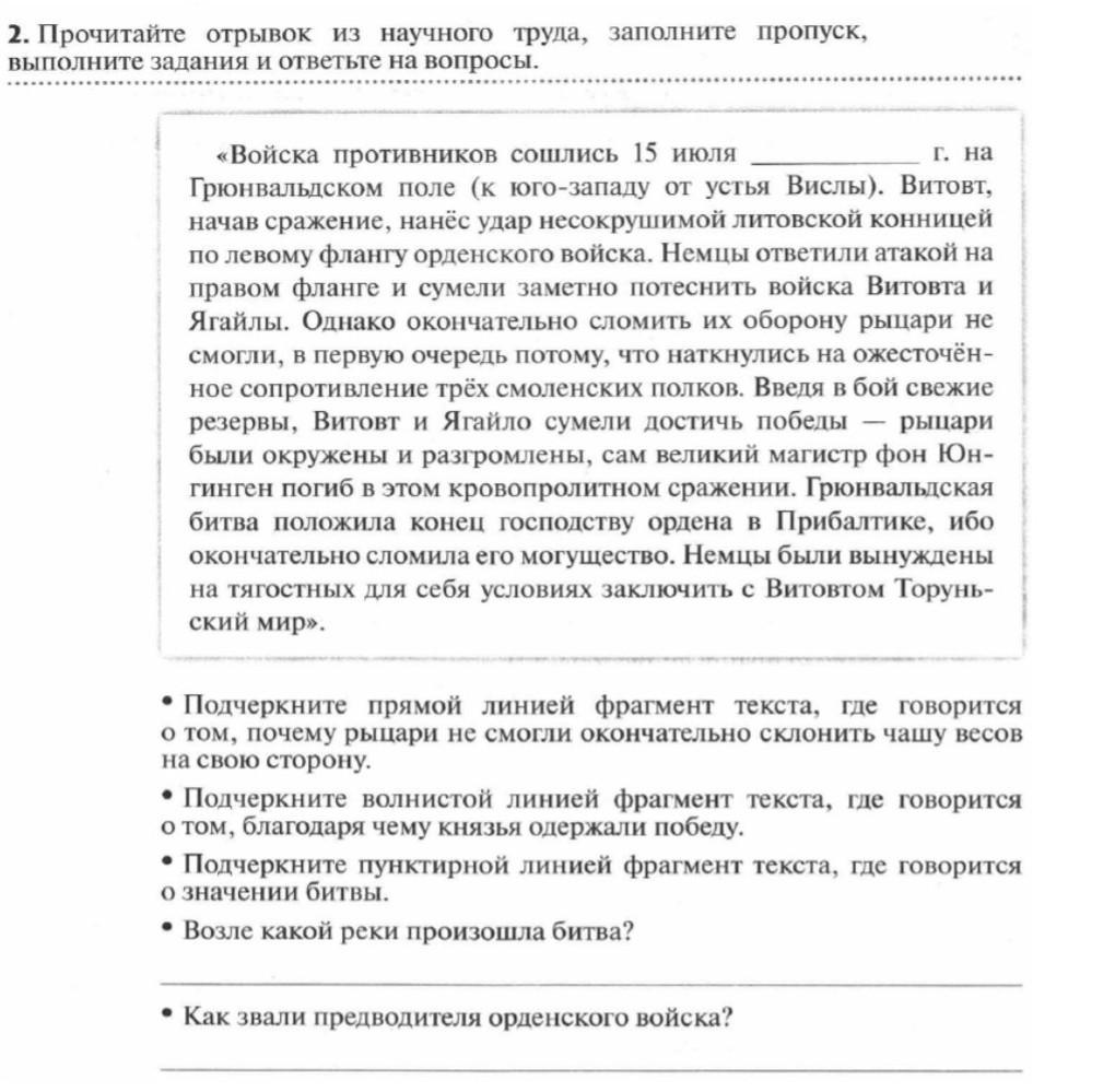 Пунктирной линией подчеркнуть - «грюнвальдская битва положила конец господству ордена в Прибалтики, ибо окончательно сломила его могущество»