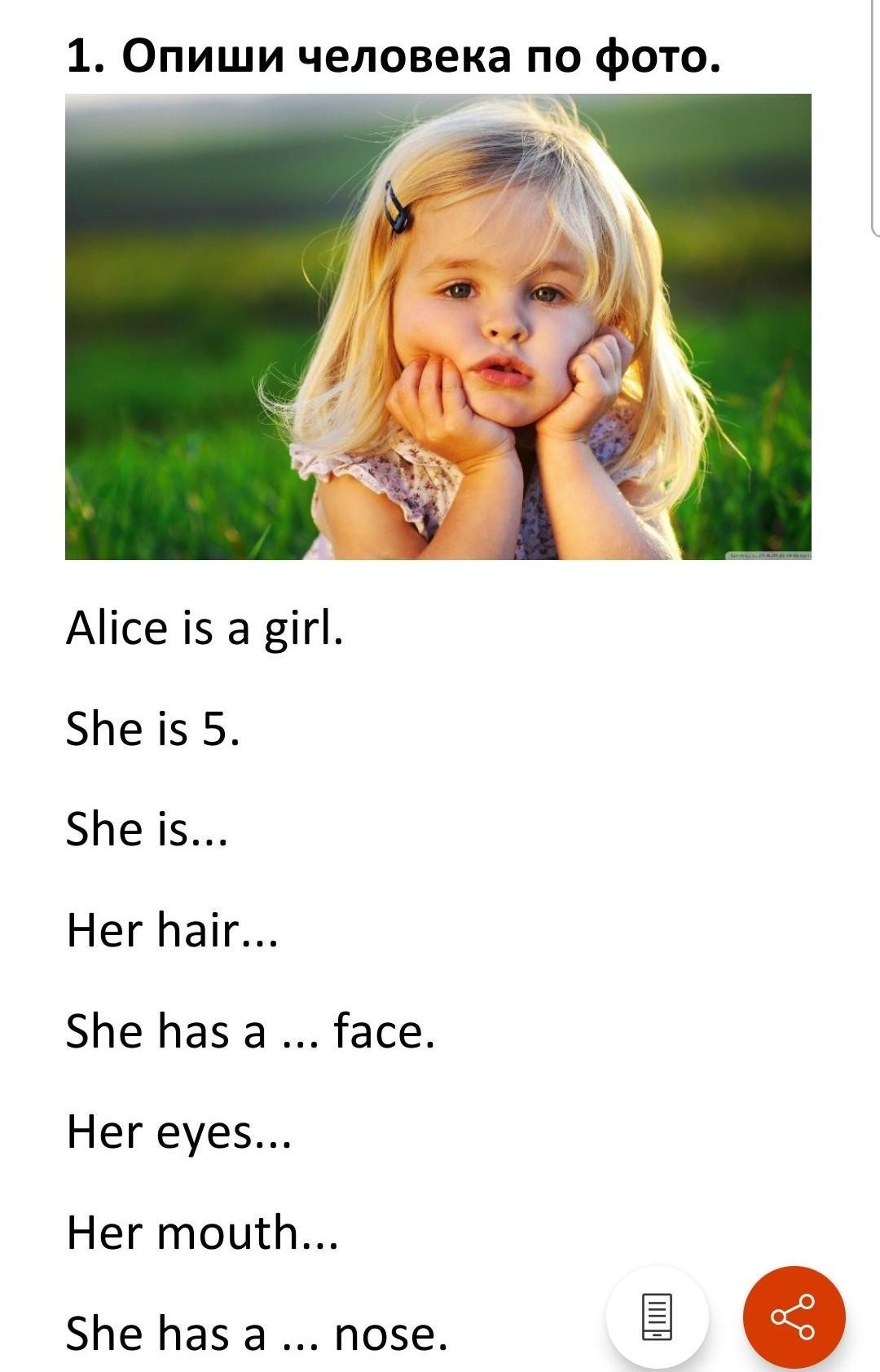 Alice is a girl. She is five years old. She is bored, maybe, she dream of something. Her medium-length hair is blond. She has a cute face. Her eyes are blue. Her mouth is small. She has a small nose.