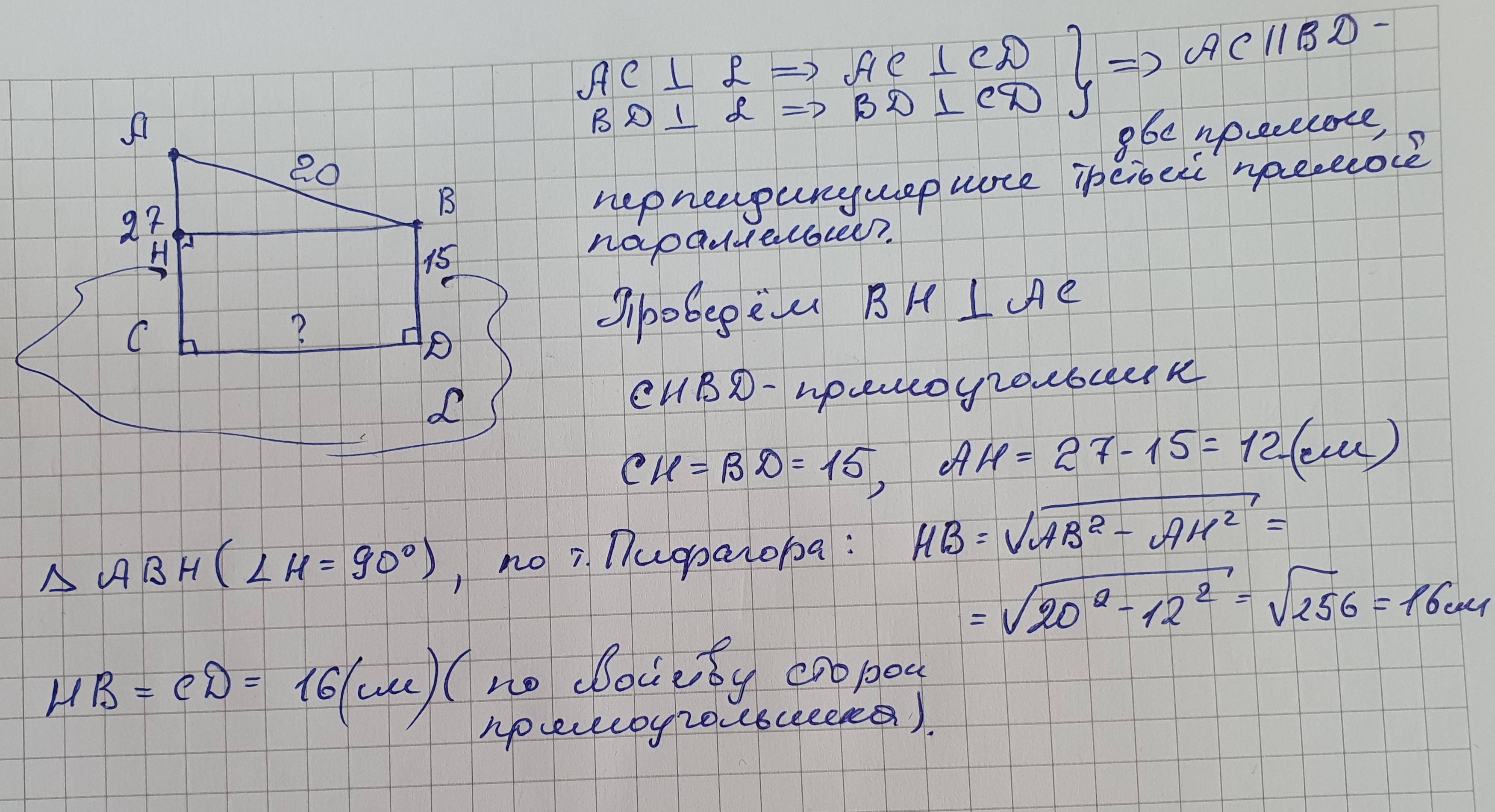А и В –точки вне плоскости α; АС и ВД- перпендикуляры на эту плоскость; АВ=20см, АС=27см, ВД=15см. Найти СД.