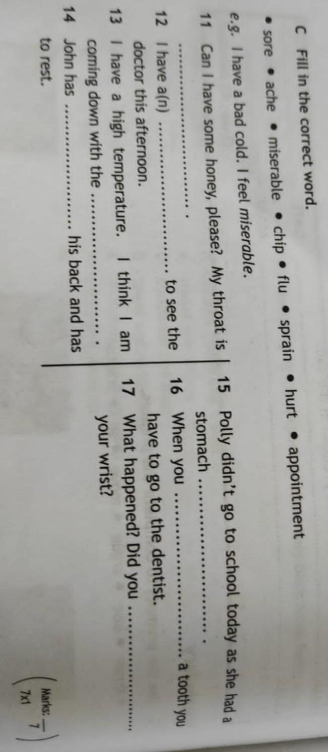 1 sore; 2 appointment; 3 flu; 4 hurt; 5 ache; 6 chip; 7 sprain