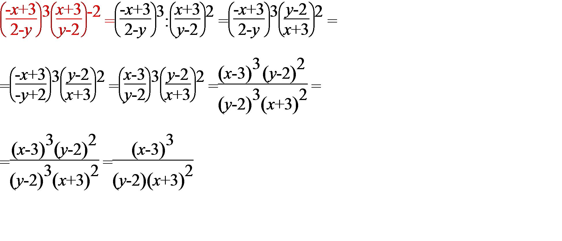 Помогите пожалуйста!!! (- x+3 деленое (дробью) на 2-y)^3 умножить (x+3 деленое (дробью) на y-2)^-2