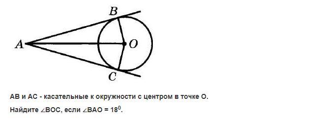 Так как АВ и АС - касательные, то ОВ ⊥ АВ, ОС ⊥ АС. ΔВАО = Δ САО ⇒ угол САО = углу ВАО = 18, СУмма углов АВОС равна 360 ⇒ ∠ ВОС = 360 - (∠АВО + ∠АСО + ∠ВАС) = 360 - (90 + 90 + 2∠ВАО)