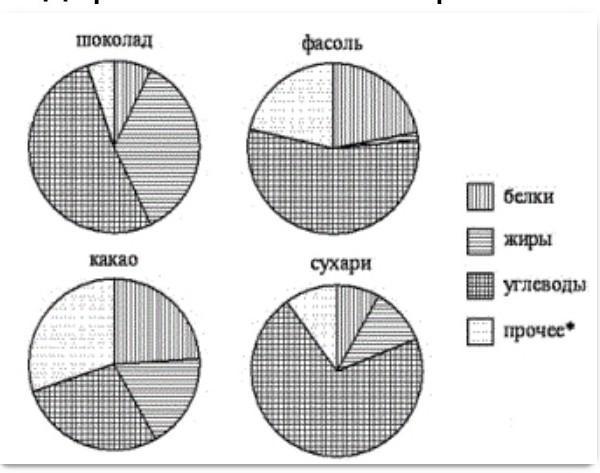 На диаграмме показано содержание питательных веществ в какао, молочном шоколаде, фасоли и сушёных белых грибах. Определите по диаграмме, в каком продукте содержание белков превышает 30%.