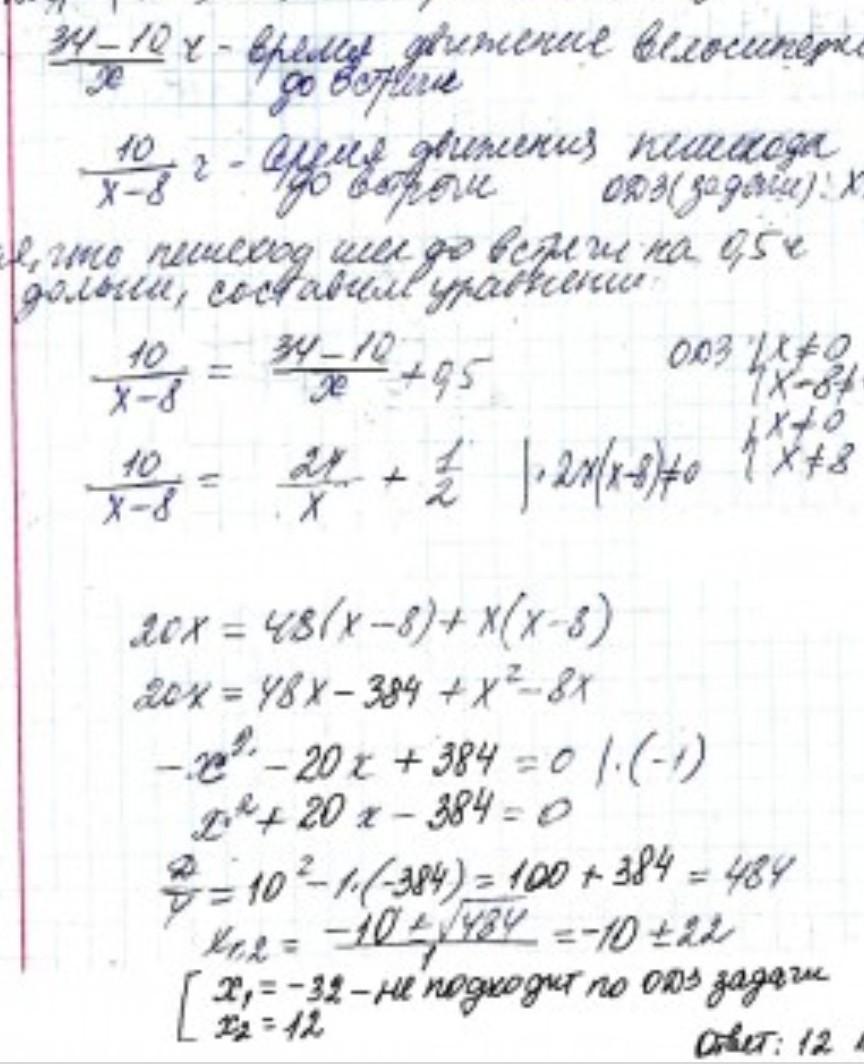 Из пункта А в пункт В, расстояние между которыми 34 км, вышел пешеход. Через 30 минут после этого из пункта В в пункт А выехал велосипедист, скорость которого на 8 км/ч больше скорости пешехода. Проехав 24 км, он встретился с пешеходом. Найдите скорость пешехода и скорость велосипедиста.