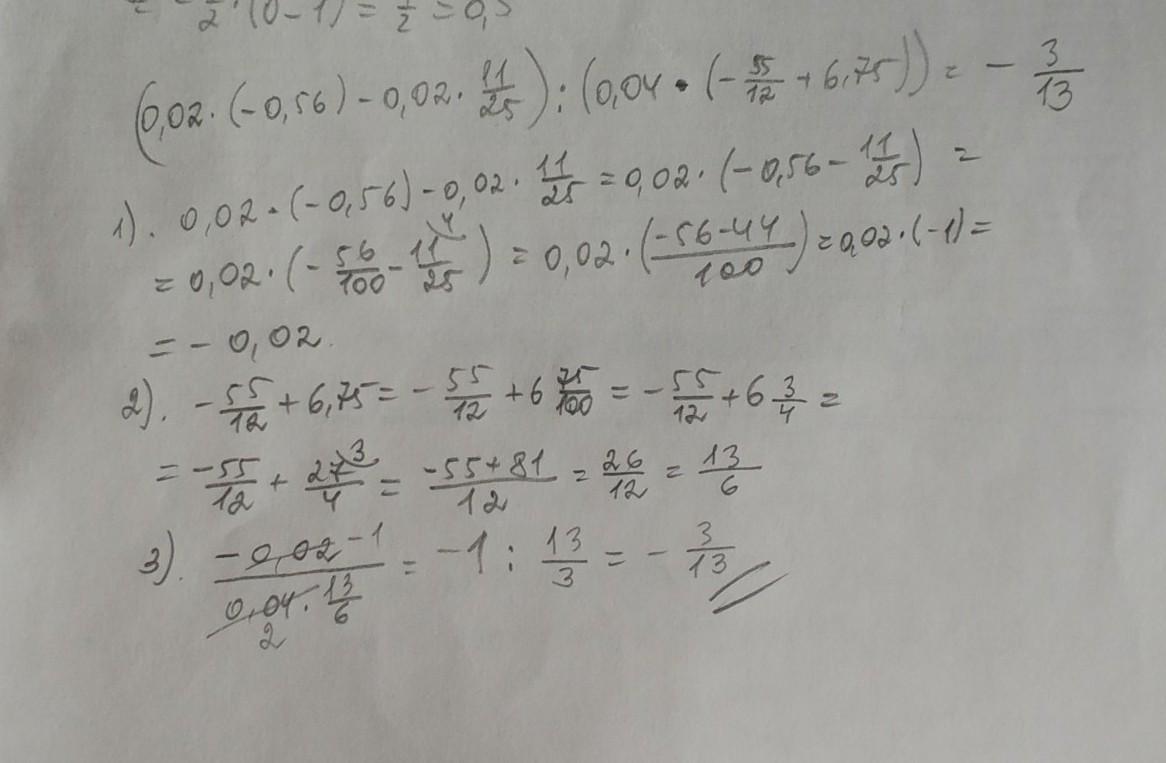 Обчисліть: (0,02⋅(-0,56)-0,02⋅11/25):(0,04⋅(-55/12+6,75))