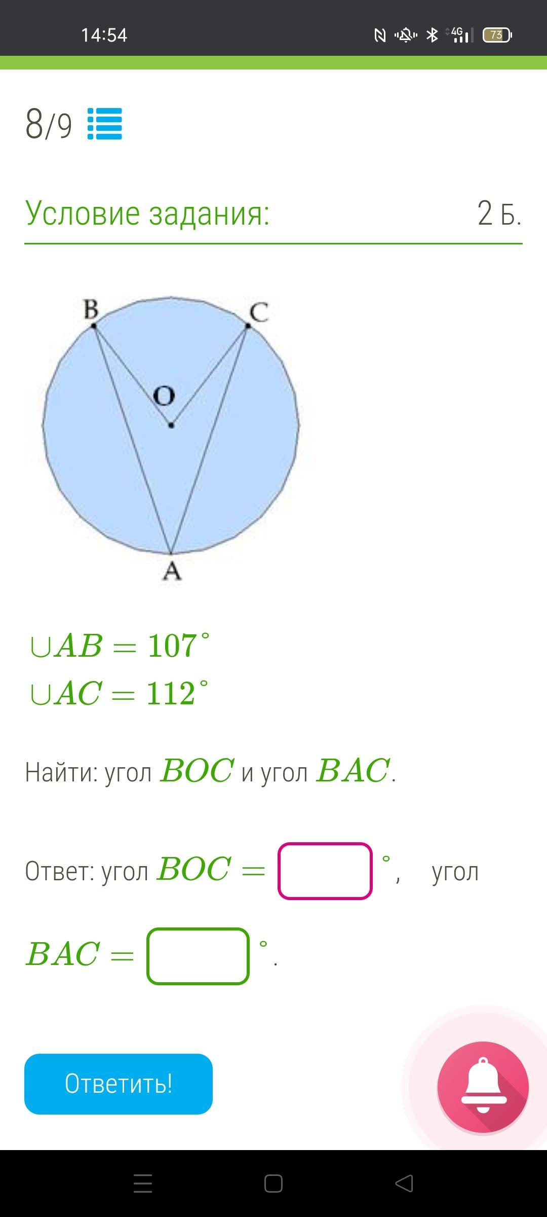 Дуга ВС=360°-(107°+112°)=141°