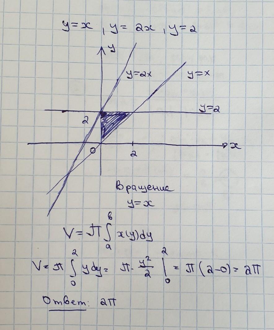 Найти объем тела, полученного вращением вокруг оси Oy фигуры, ограниченной линиями: y=x ,y= 2x ,y=2 . Построить тело в декартовой системе координат.