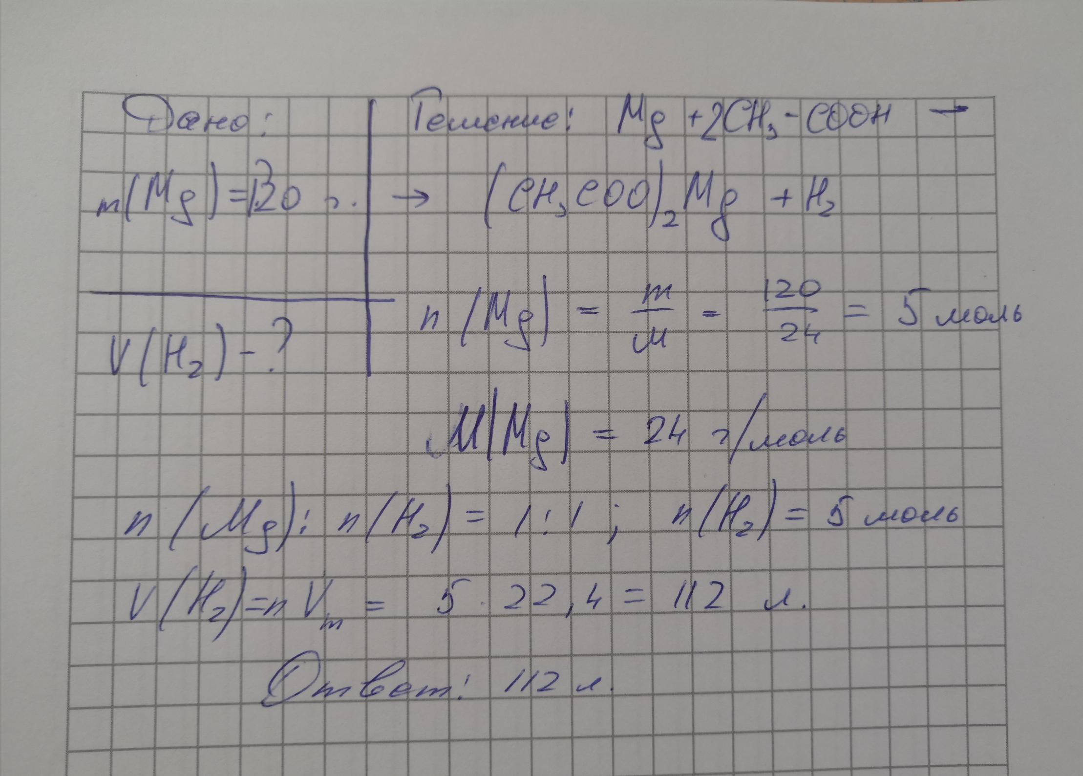 Объем водорода (н. у.), образующегося при действии 120 г магния с избытком уксусной кислоты, согласно уравнению: