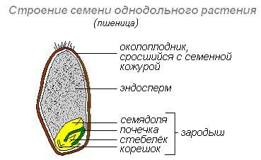 части семени однодольного растения пшеницы:покровы зерновки,ендосперм,зародыш.