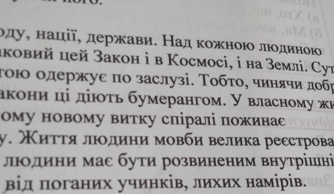 у людини є доля. Є доля й у землі,народу,нації,держави.Над кожною людиною тяжіє Найвищий закон справедливості. однаковий цей закон і в космосі,і на землі. Суть цього закону в тому,що кожна людина зрештою одержує по заслузі. Тобто чинячи добро чи зло,людина потрапляє під певні закони.Закони ці діють бумерангом. У власному житті людина наче рухається по спіралі,де на кожному новому витку спіралі пожинає результати того,що вчинила на попередньому. Життя людини мовби велика реєстрова книга,де записано все життя людини. Тому у людини має бути розвиненим внутрішній контролер-совість.Совість замінити займенник