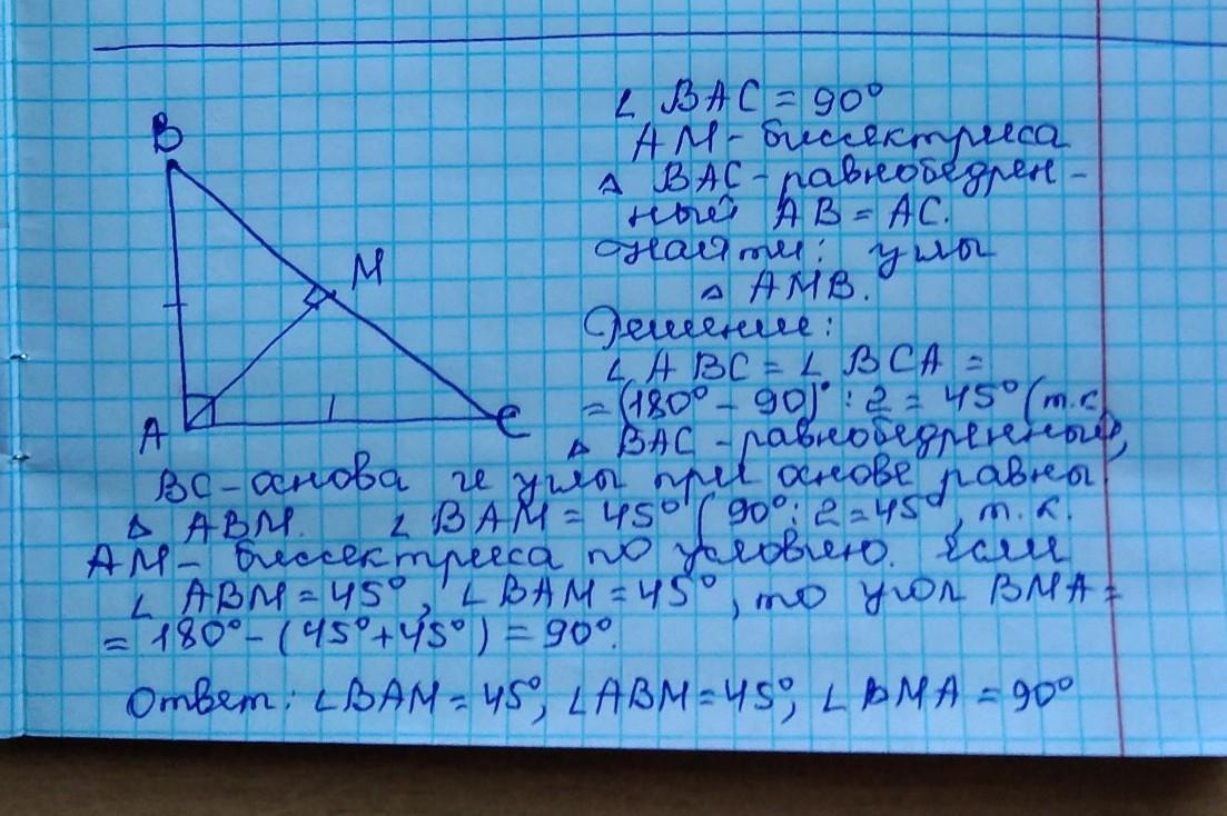 AM - биссектриса прямого угла равнобедренного прямоугольного треугольника ABC. Найдите углы треугольника ABM ( С решением )