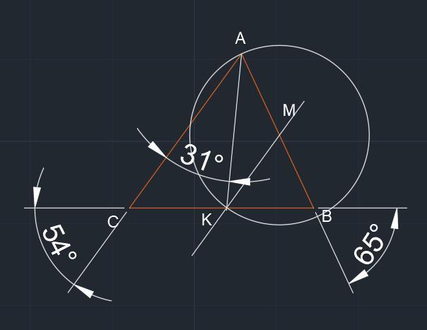 Прямая, параллельная стороне AC треугольника ABC, пересекает его стороны AB и BC в точках M и K так, что AM=MK. Известно, что угол B = 65°, угол C=54°.
