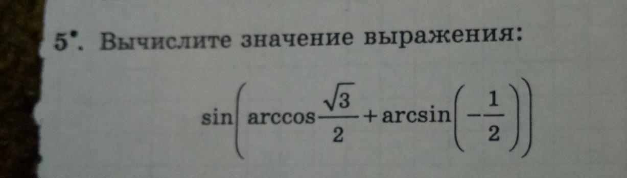 sin(arccos √3/2 + arcsin (-1/2) ) = sin(arccos √3/2 - arcsin 1/2) = sin(30°-30°) = 0