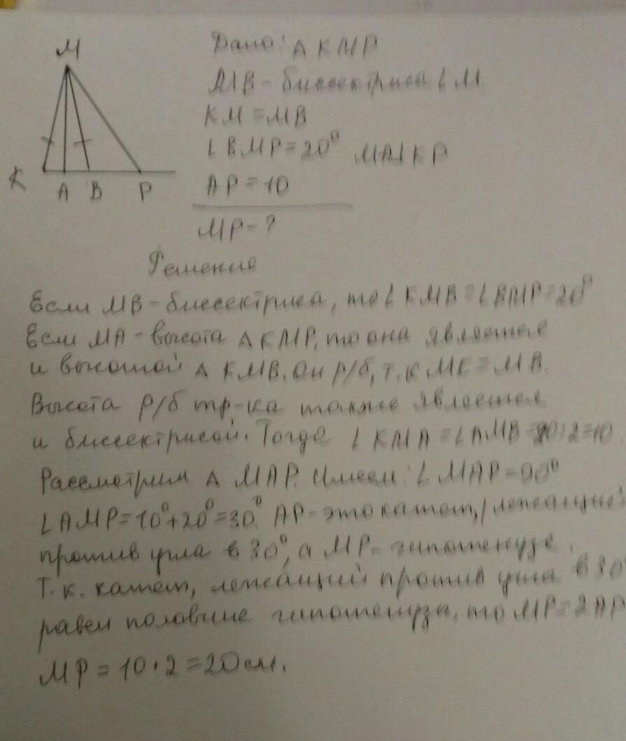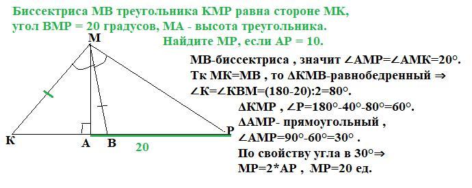 Пожалуйста помогите умоляю! Биссектриса MB треугольника KMP равна стороне MK, угол BMP = 20 градусов, MA - высота треугольника. Найдите MP, если AP = 10.
