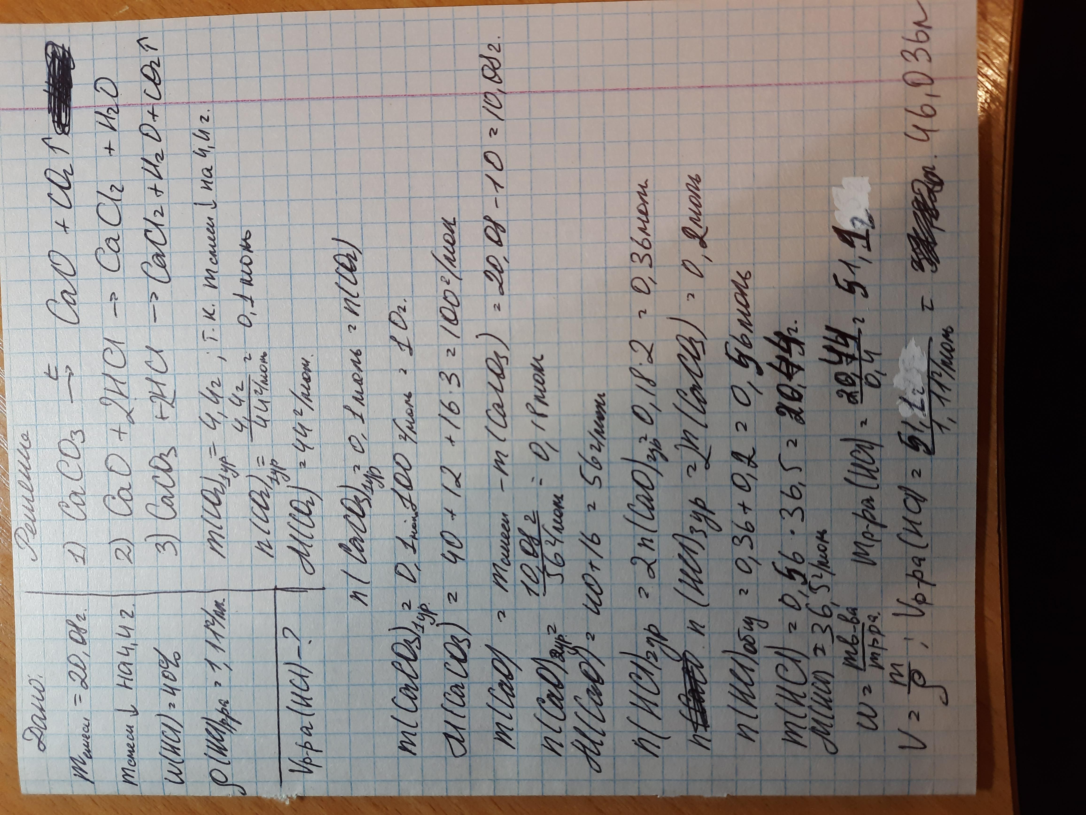 В результате нагревания 20,08 г смеси порошков оксида кальция и карбоната кальция её масса уменьшилась на 4,4 г. Вычислите объём раствора соляной кислоты (мл)с массовой долей 40% и плотностью 1,11 г/мл, который потребуется для растворения исходной смеси. Записывайте уравнения реакций, которые указаны в условии задачи, приводите все необходимые вычисления.
