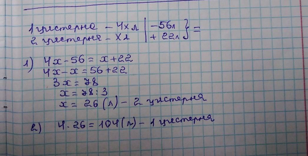 В одній цистерні було в 4 рази більше води, ніж у другій.Коли з першої цистерни вилили 56 л води, а другу долили 22 л то води в обох цистернах стало .скільки літрів води було в цистернах спочатку? СРОЧНО ПОЖАЛУСТА