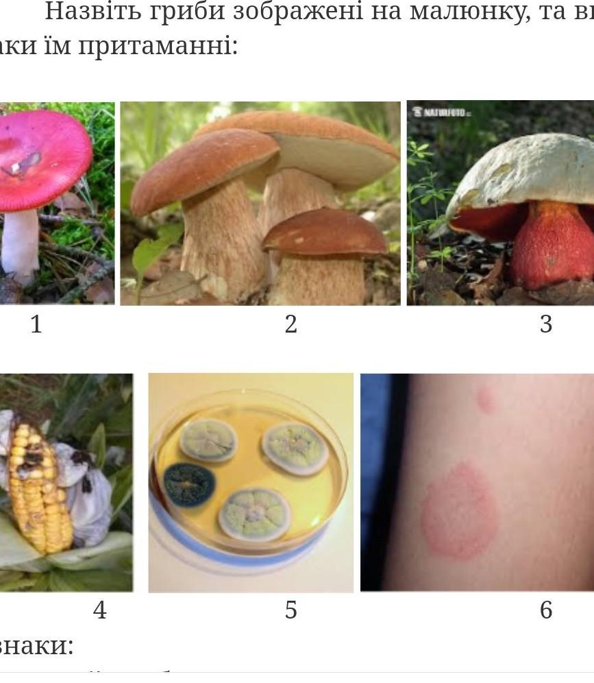 Назвіть гриби зображені на малюнку, та визначте, 20. які ознаки ім притаманні: