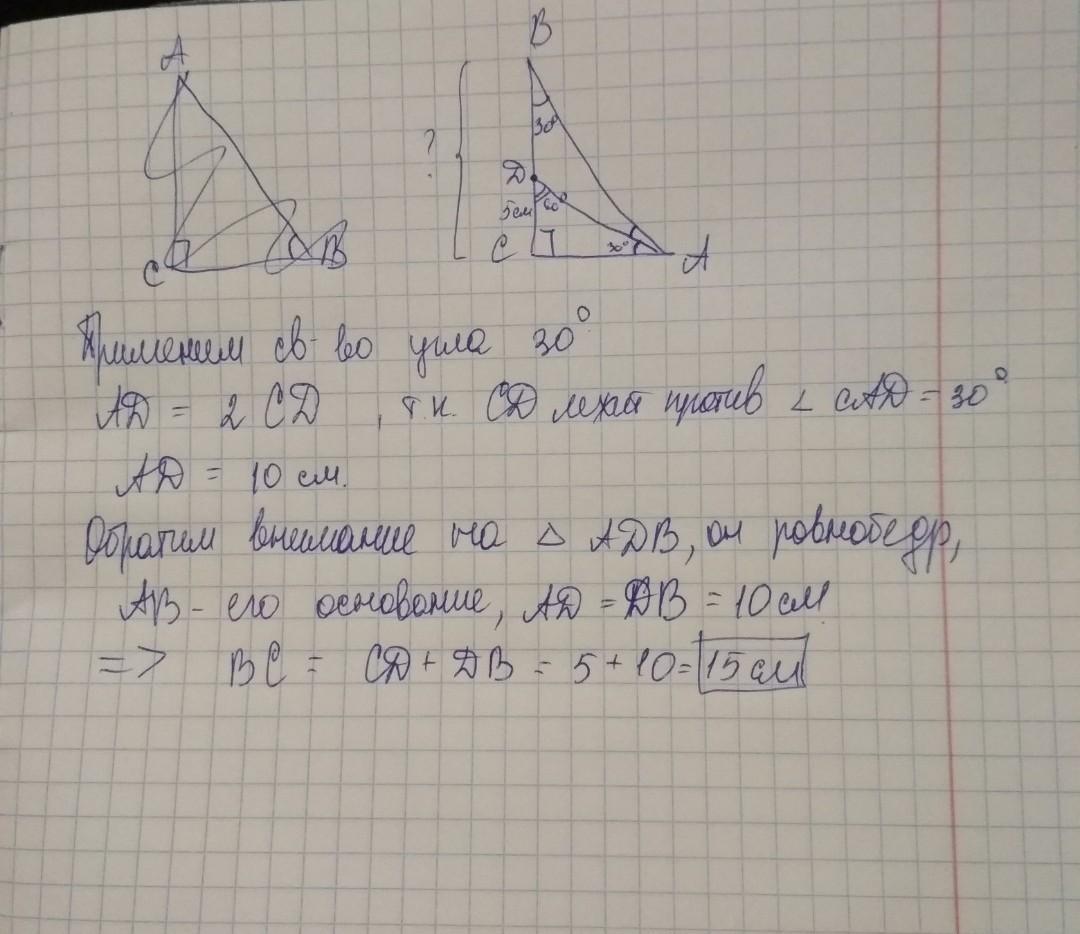 У △ABC ∠B=30°. На катеті ∠BC позначено точку D, таку що △ADC=60°. Знайдіть довжину катета BC, якщо CD=5см.