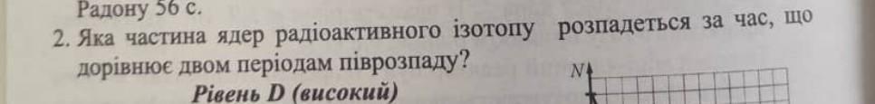 яка частина ядер радіоактивного ізотопу розпадеться за час, що дорівнює двом періодам піврозпаду?