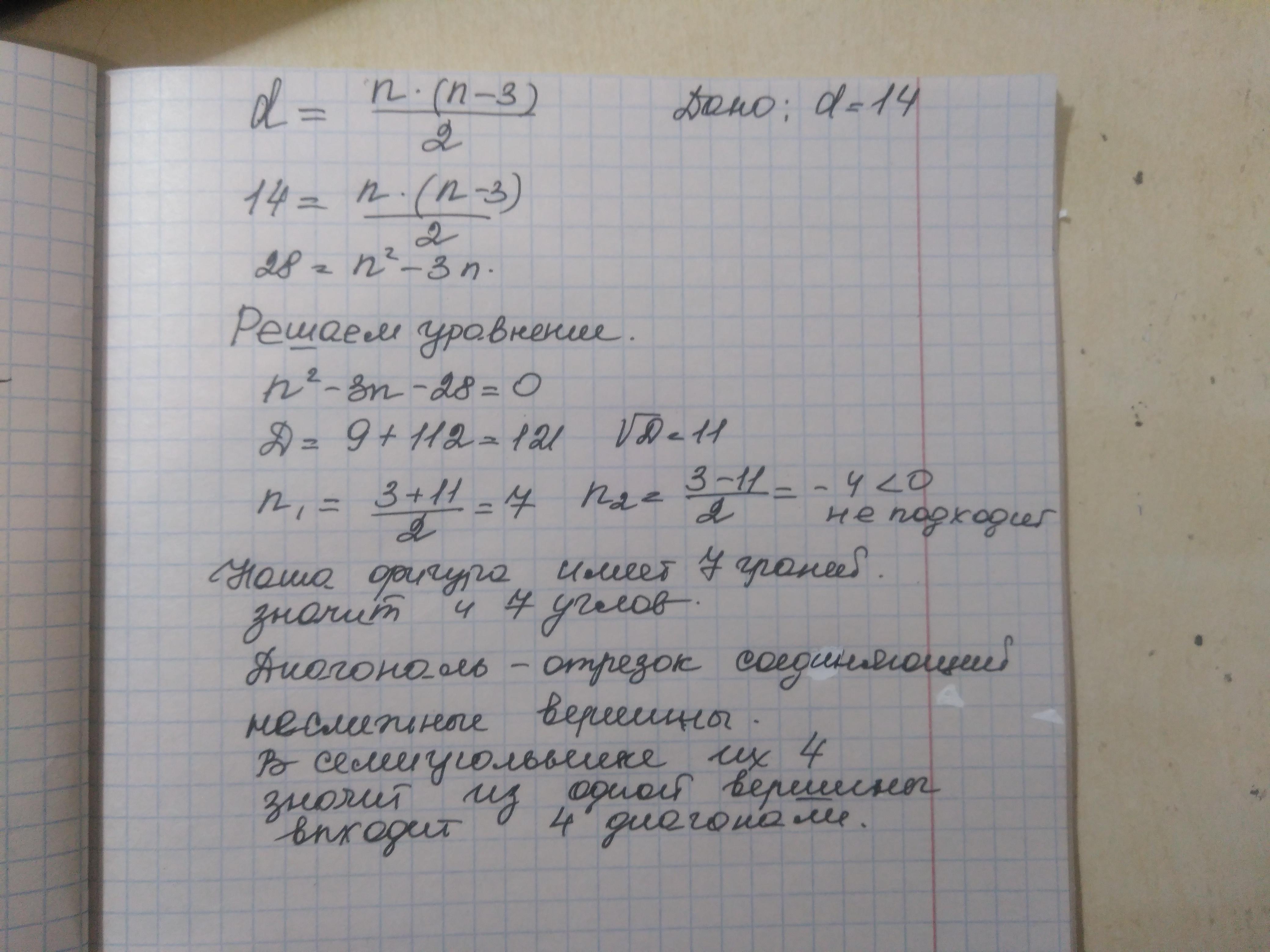 найдите число диагоналей исходящих из одной вершины выпуклого многоугольника имеющего 14 диагоналей
