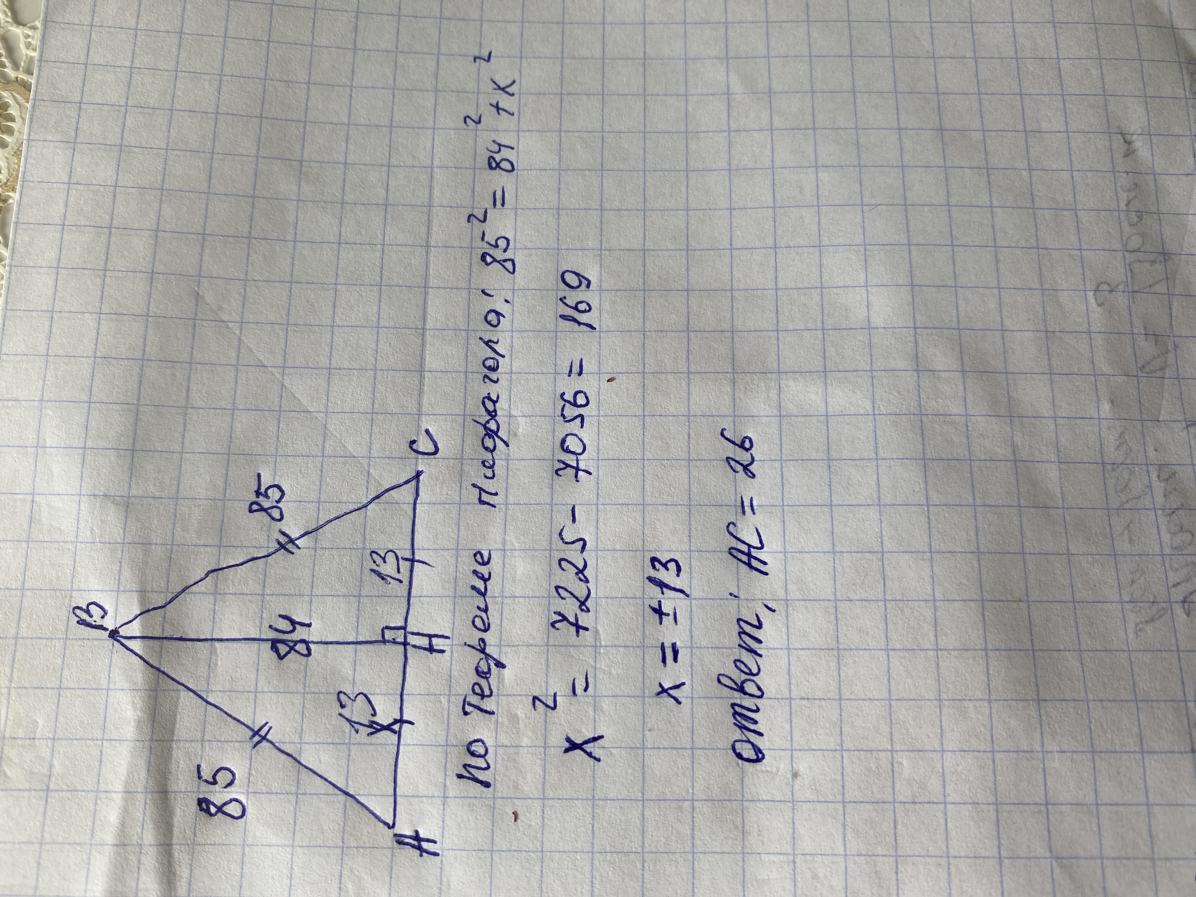 Боковая сторона равнобедренного треугольника равна 85,а его высота проведённая к основанию,равна 84.Найдите основание данного треугольника.