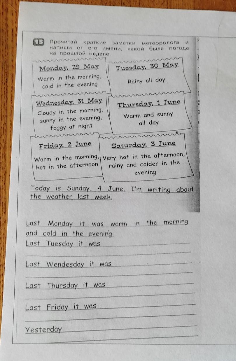 2) Last Tuesday it was rainy all day. 3) Last Wednesday it was cloudy in the morning, sunny in the evening and foggy at night. 4) Last Thursday it was warm and sunny all day. 5) Last Friday it was warm in the morning and hot in the afternoon. 6) Yesterday it was very hot in the afternoon and rainy and colder in the evening.