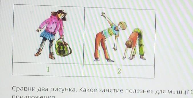 на второй картинке занятие полезнее для мышц, потому что мальчики делают разминку для спины. на первой ,девочка несёт тяжёлый портфель . он искривляет позвоночник в сторону, где держится портфель и нагружает все тело