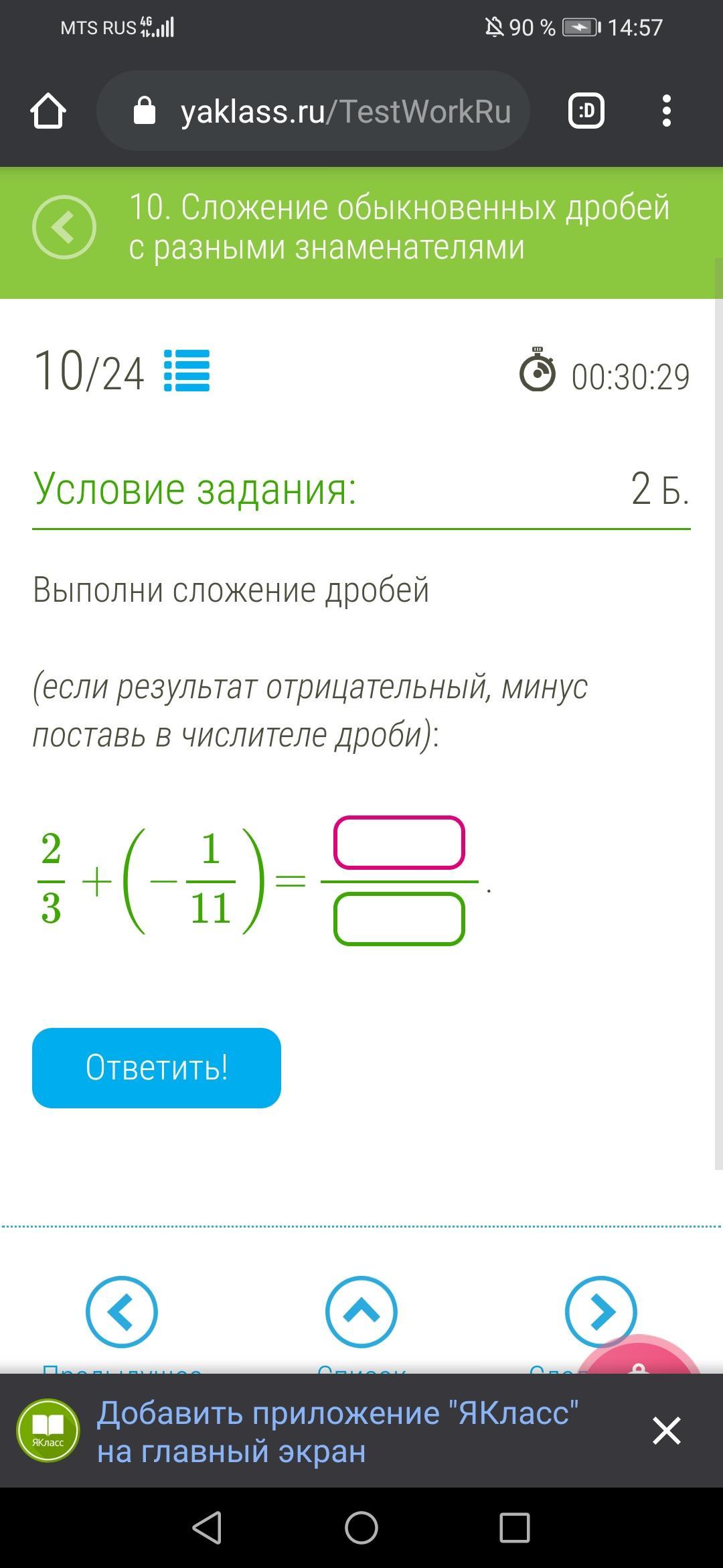 2/3 + (-1/11) = 2/3 - 1/11 =