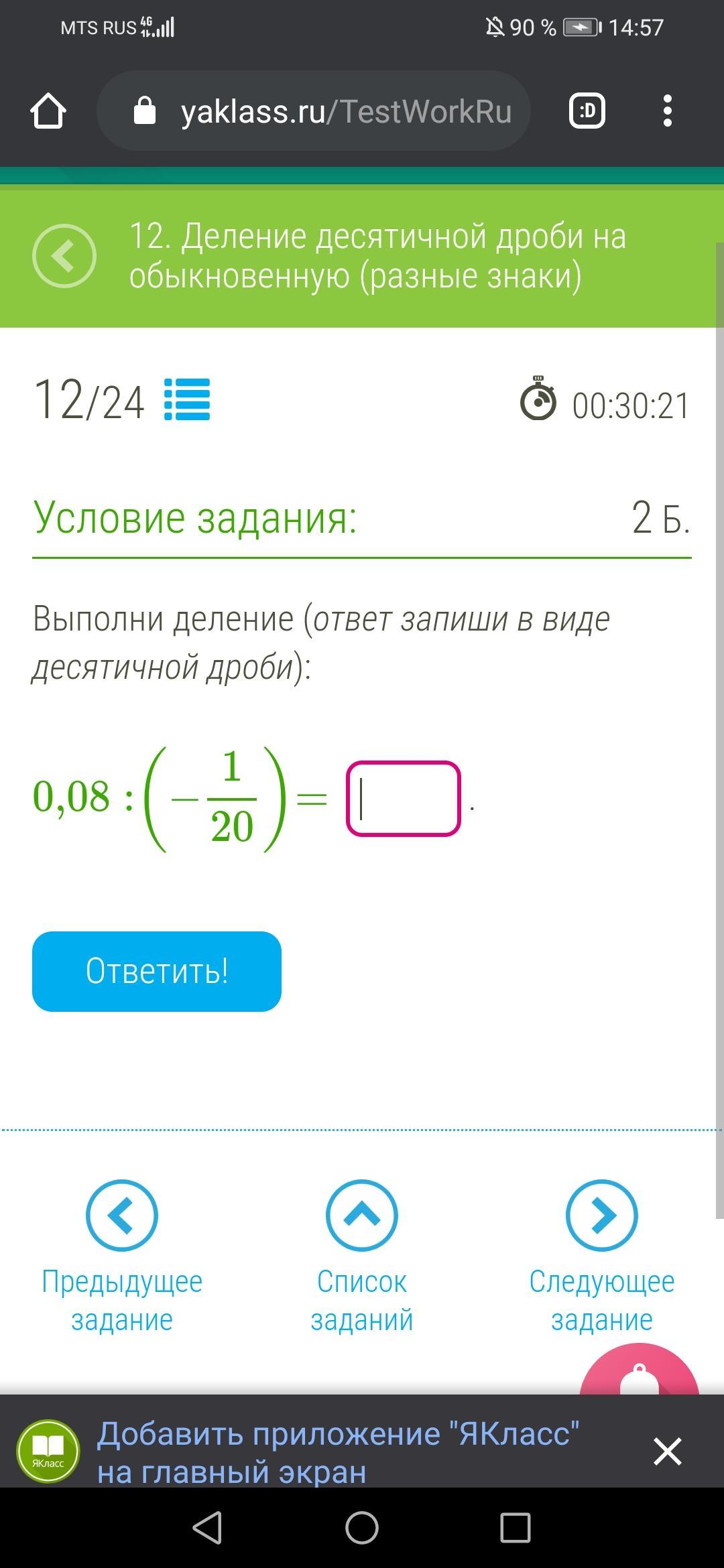 0,08 : (-1/20) = 8/100 : (-1/20) = 8/100 * (-20/1) = 8/5 * (-1/1) = -8/5 = -1. 3/5