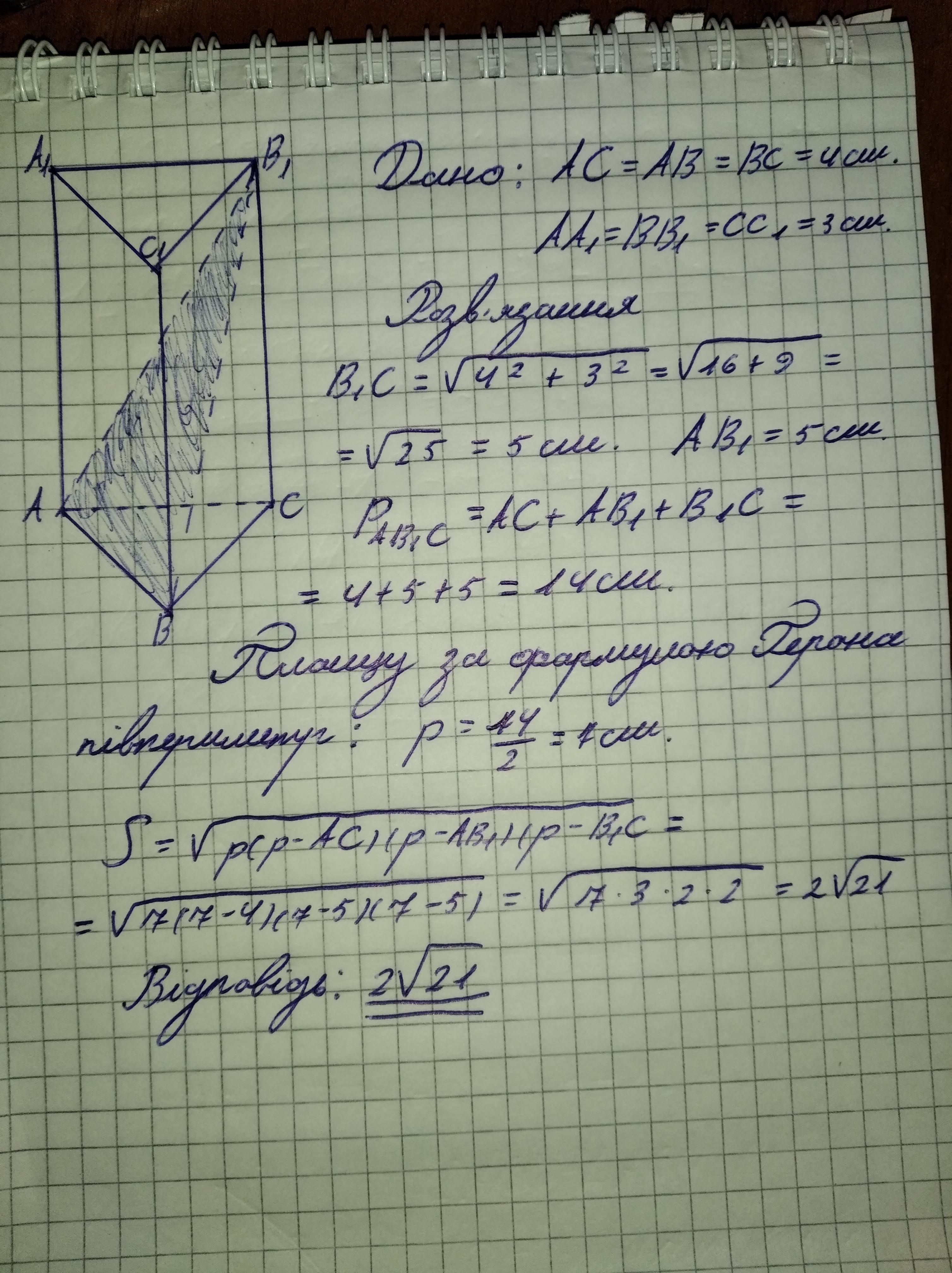 ) Побудуйте зображення правильної трикутної призми, у якої бічне ребро має довжину 3 см, а ребро основи – 4 см. Знайдіть периметр і площу перерізу, що проходить через сторону нижньої основи і протилежну вершину верхньої основи.