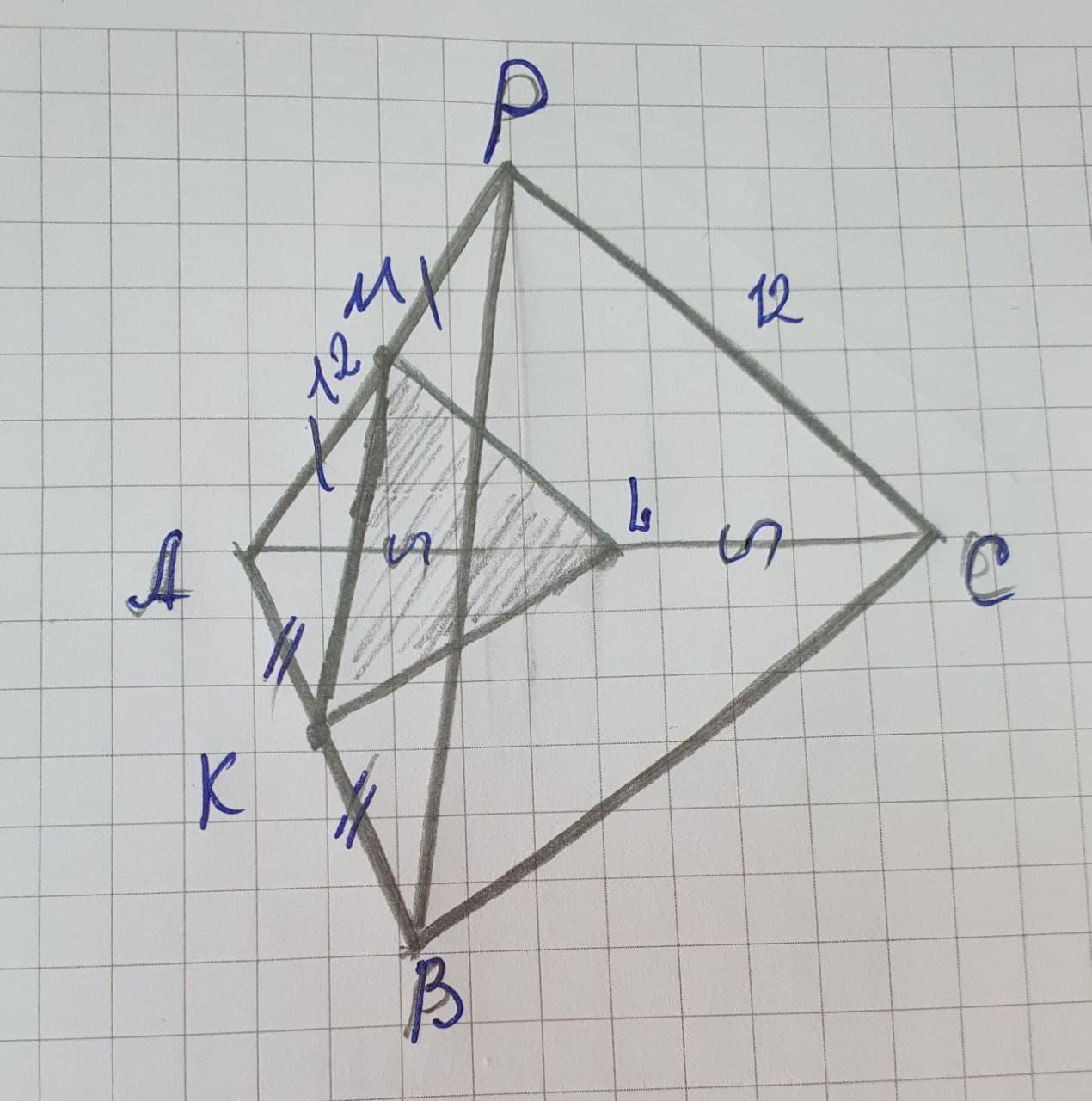 Сечение пройдет через середины ребер АP и АВ по линии KM.