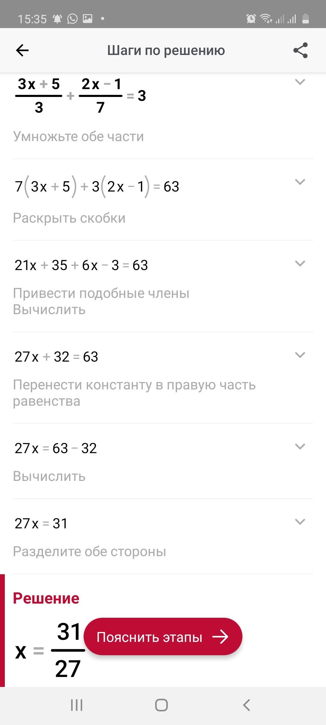 Приведем к общему знаменателю: (3x + 5)*7 + (2x - 1)*3 = 3*3*7