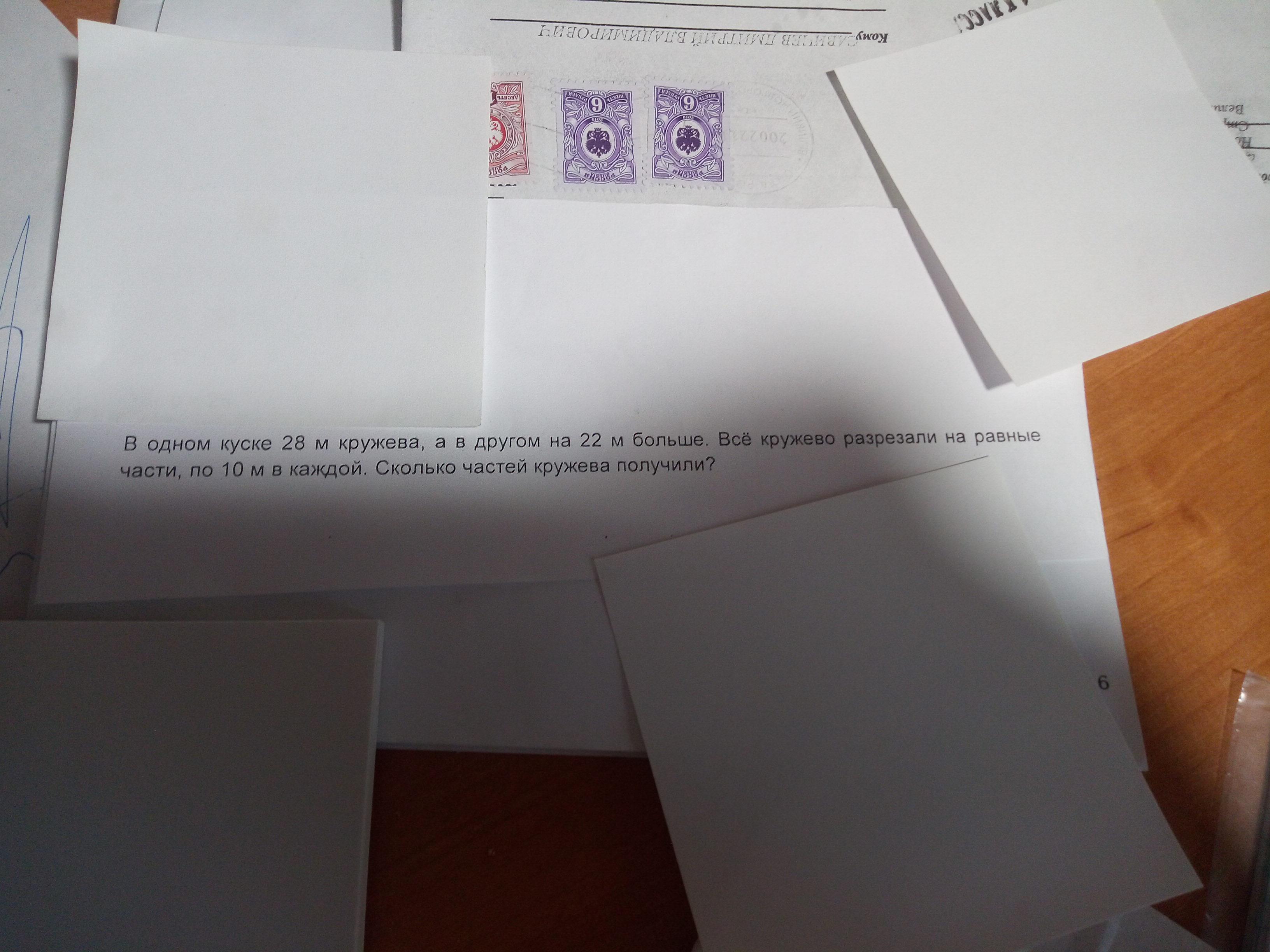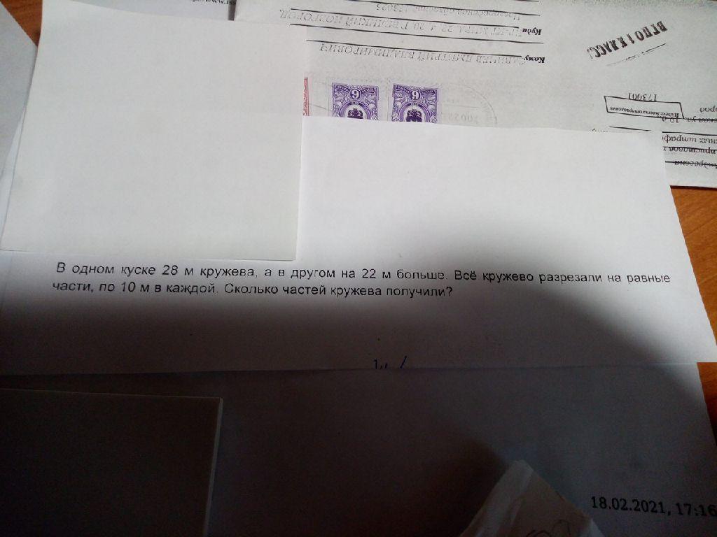 В 1 куске 28 кружева а в другом на 22 больше.Это разреразлина равные части по 10 метров.Сколькочастей кружева получили?
