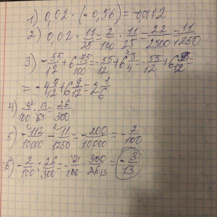 Обчисліть: (0,02⋅(-0,56)-0,02⋅11/25):(0,04⋅(-55/12+6,75))