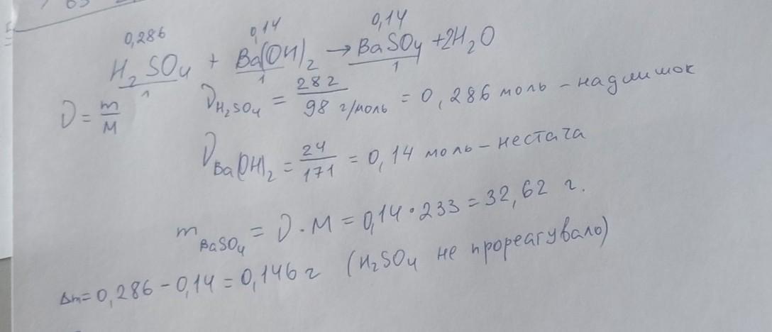 До розчину, що містить 28 г сульфатної кислоти, додали барій гідроксид масою 24 г. Обчисліть масу утвореної солі та масу надлишкової речовини, що не прореагувала.